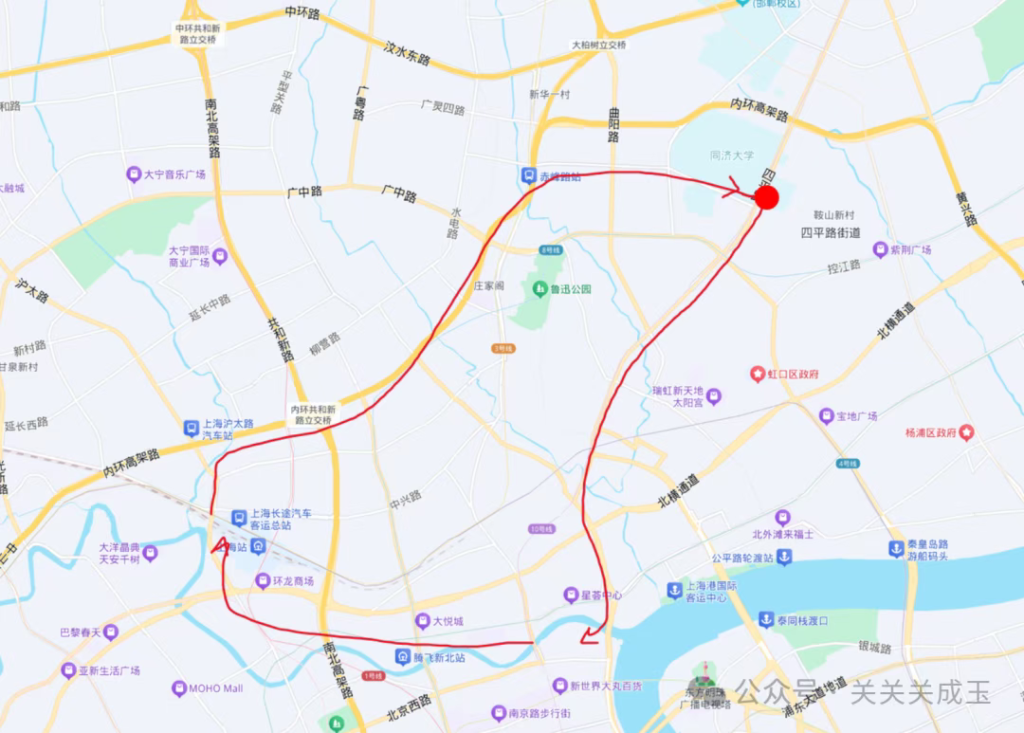 我最喜欢的骑行路线是沿四平路去苏州河,骑到规划路线的尽头折返或者走内环高架路下非机动车道回学校,一般来回差不多25公里,一个小时,到学校吃一碗吊龙米线。